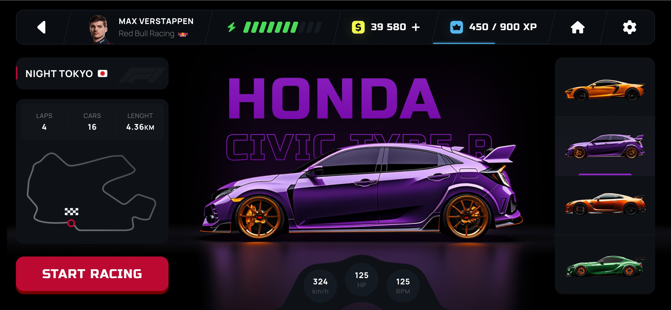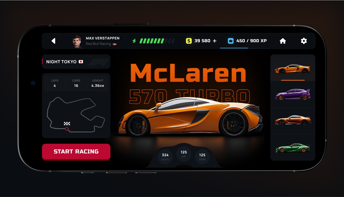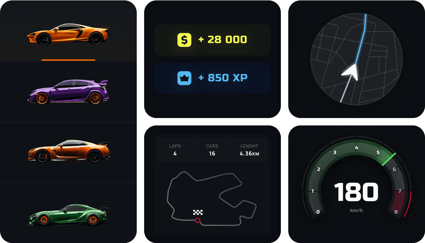 The interface was designed for clarity and immersion — bold visuals highlight speed, position, and laps without breaking the flow. Unique racing cars are seamlessly integrated into the UI, unlocked through events to keep players motivated and engaged