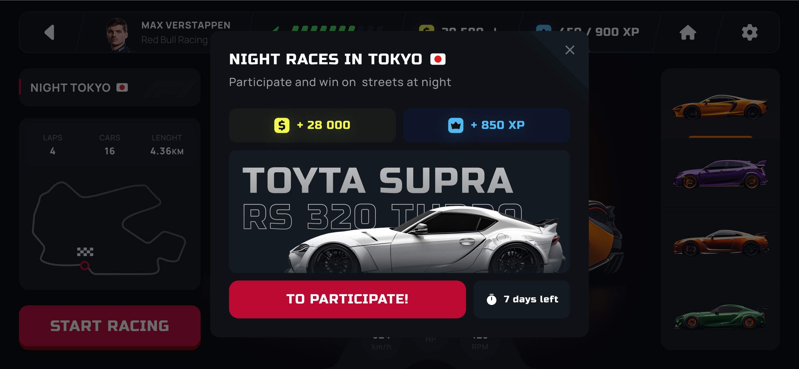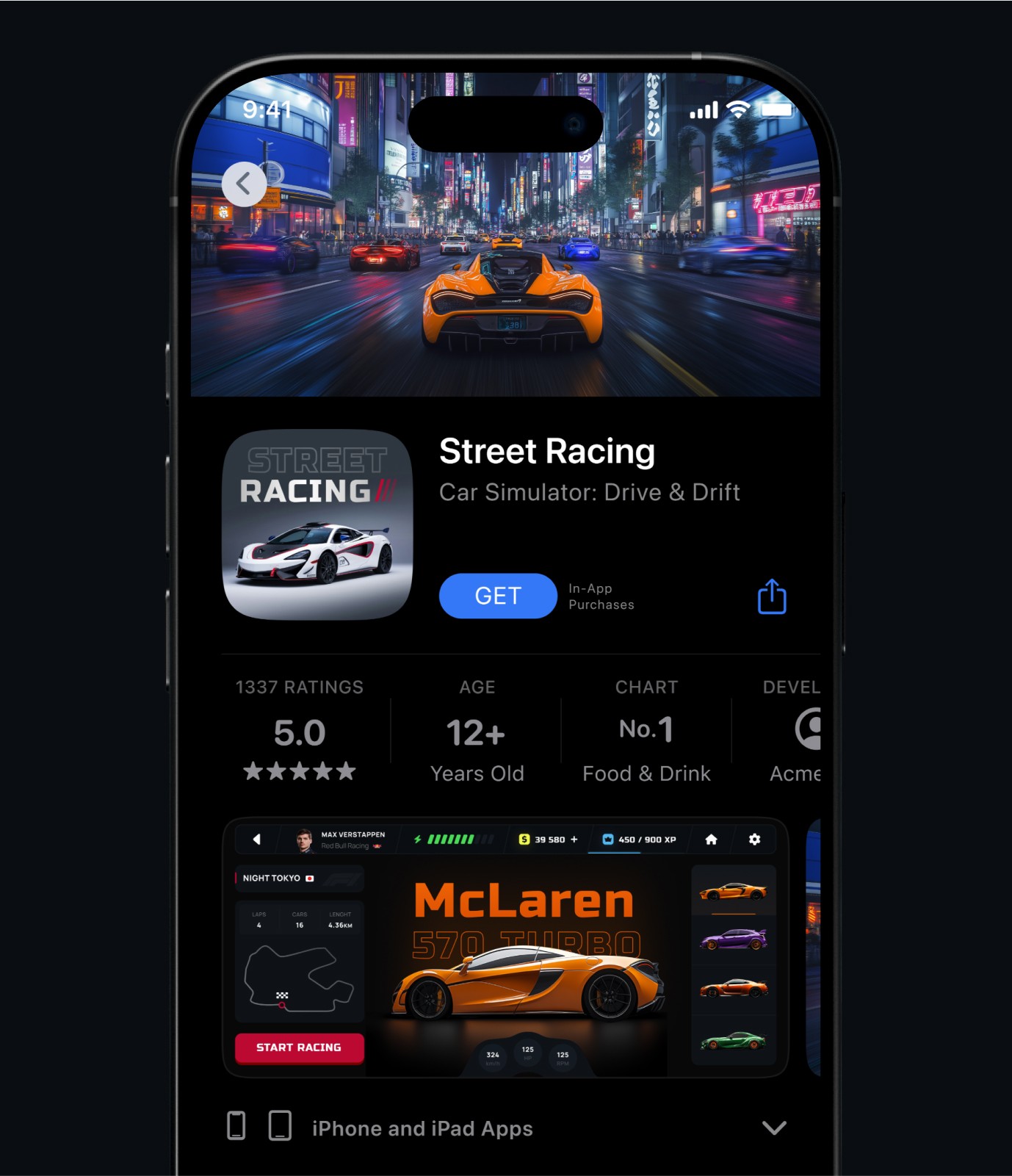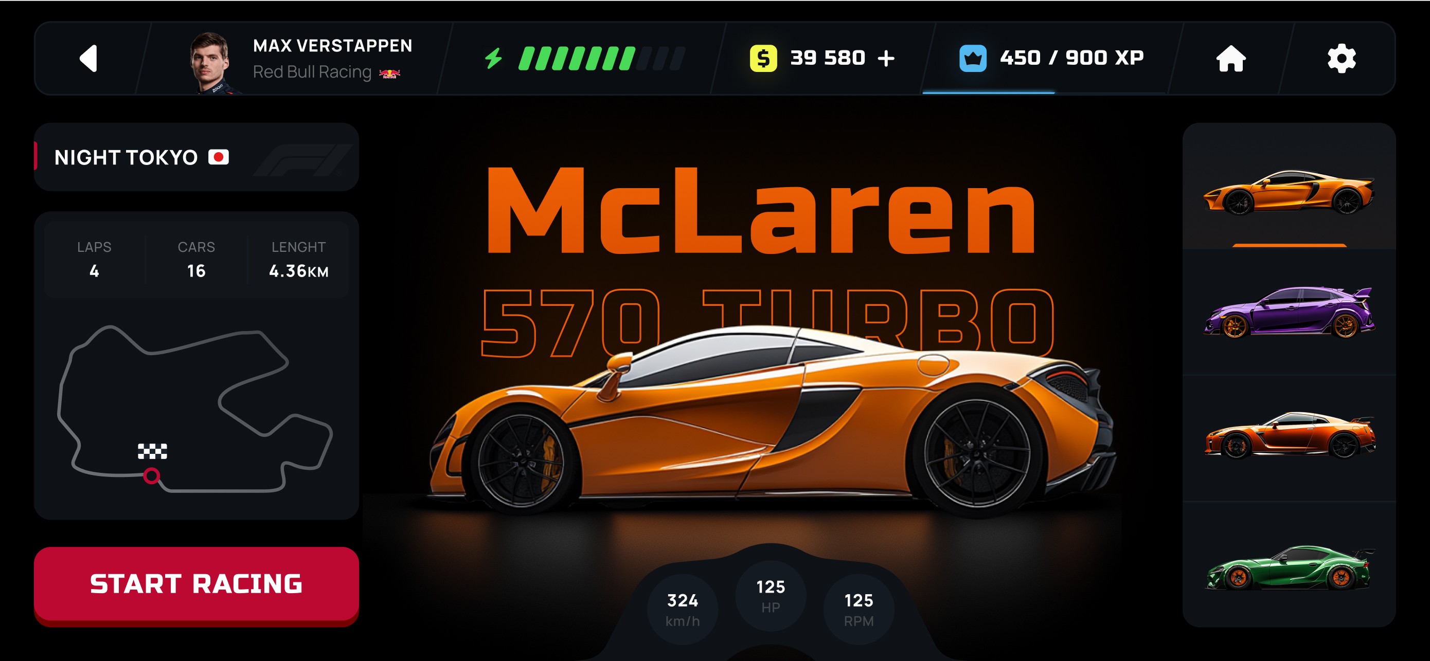 The interface was designed for clarity and immersion — bold visuals highlight speed, position, and laps without breaking the flow. Unique racing cars are seamlessly integrated into the UI, unlocked through events to keep players motivated and engaged