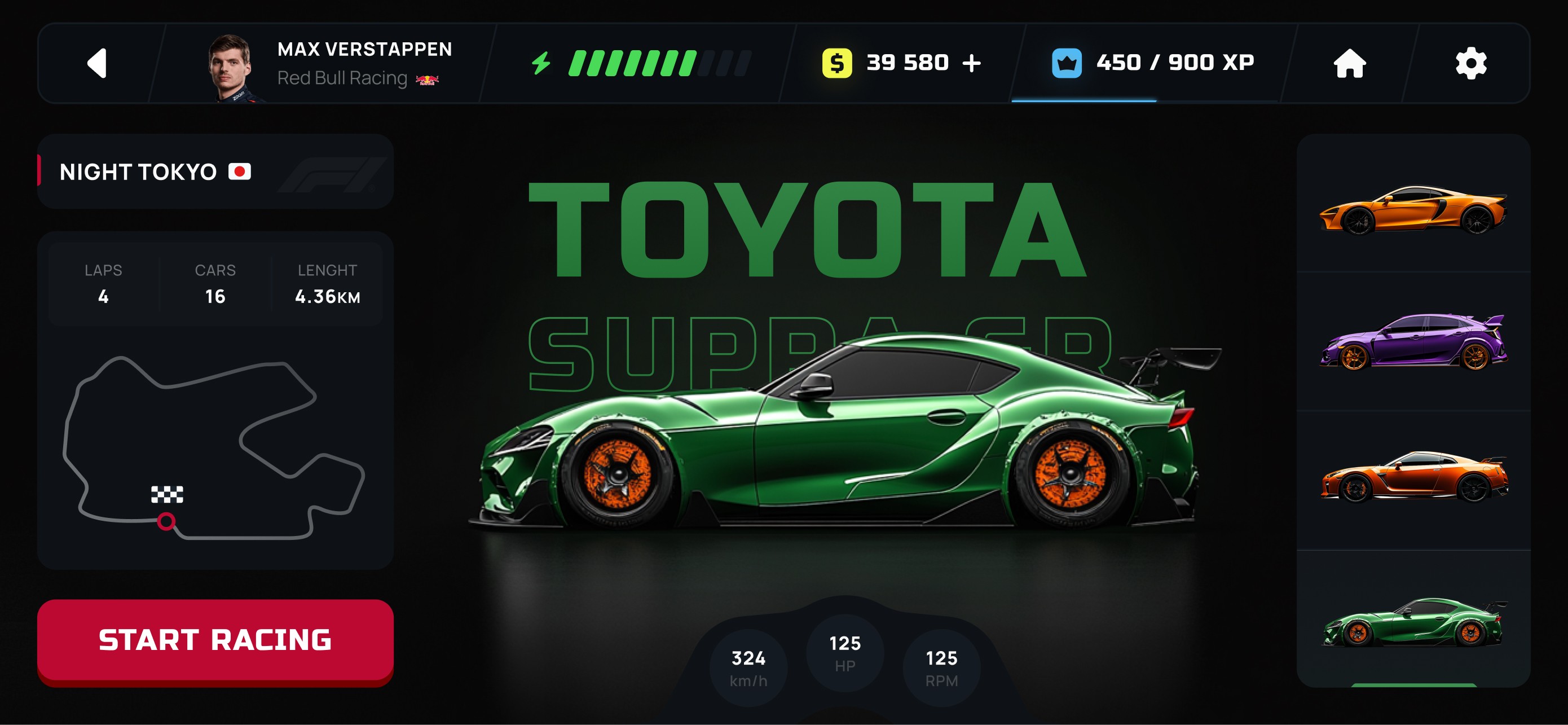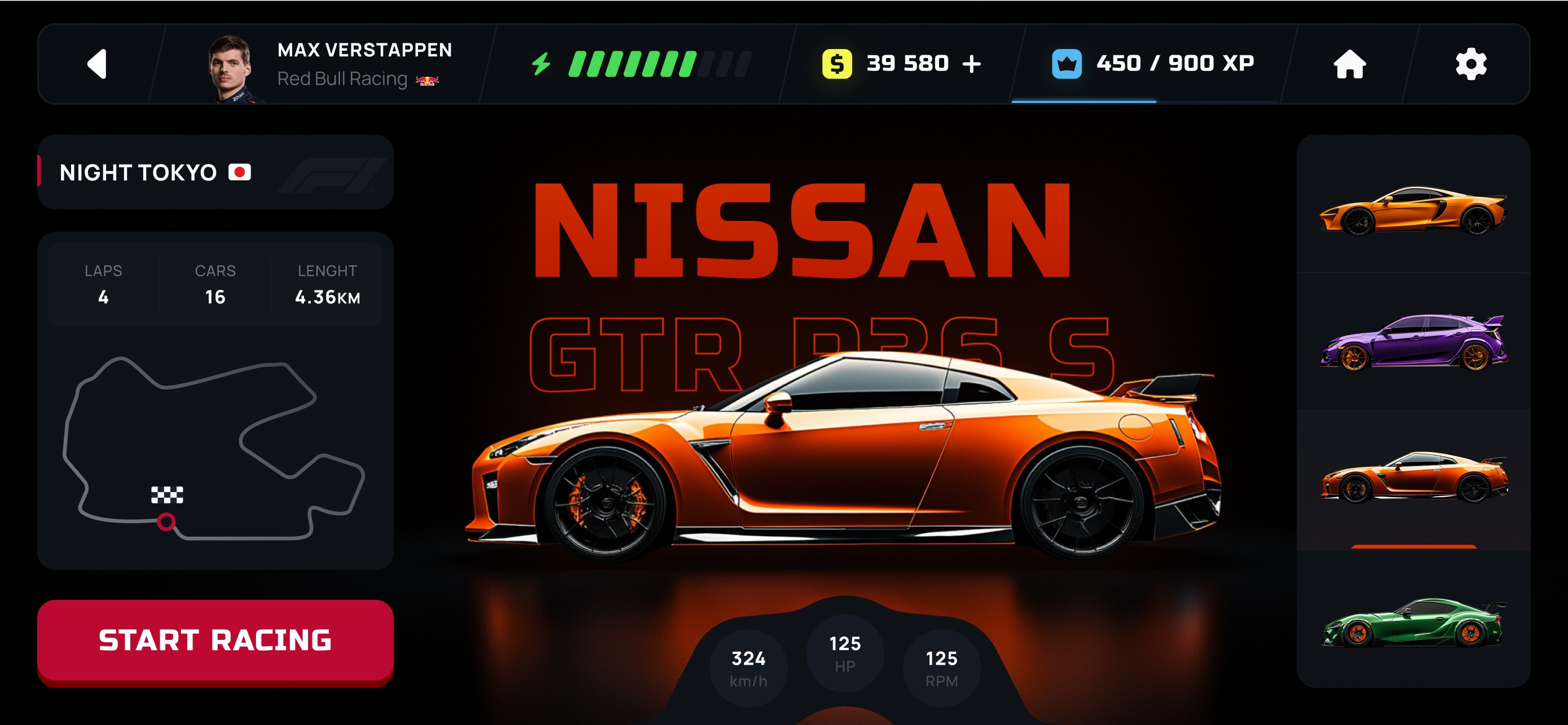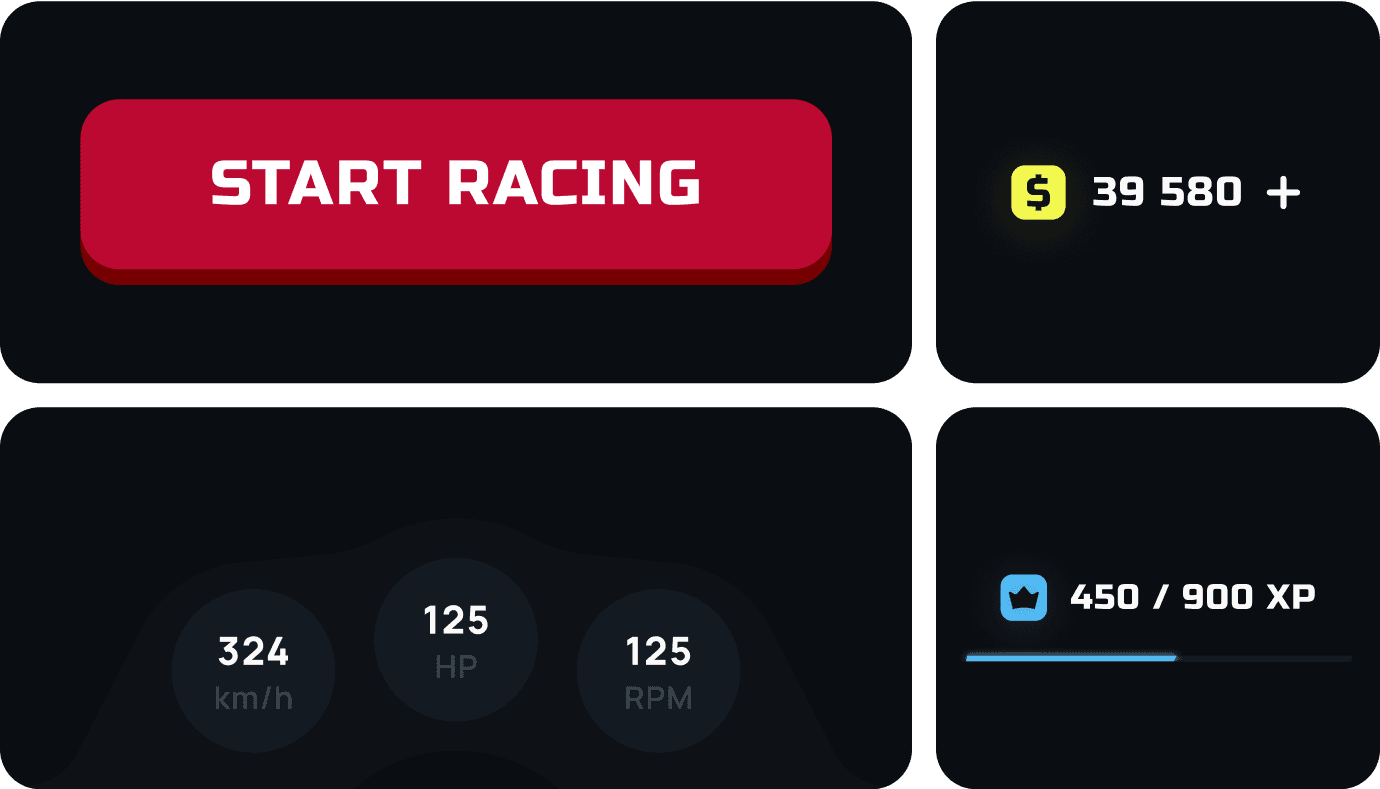Developed an immersive and intuitive UI for the racing experience, combining clarity with high-energy visuals. Designed a consistent style system that highlights cars, tracks, and player stats, ensuring both usability and an authentic racing atmosphere