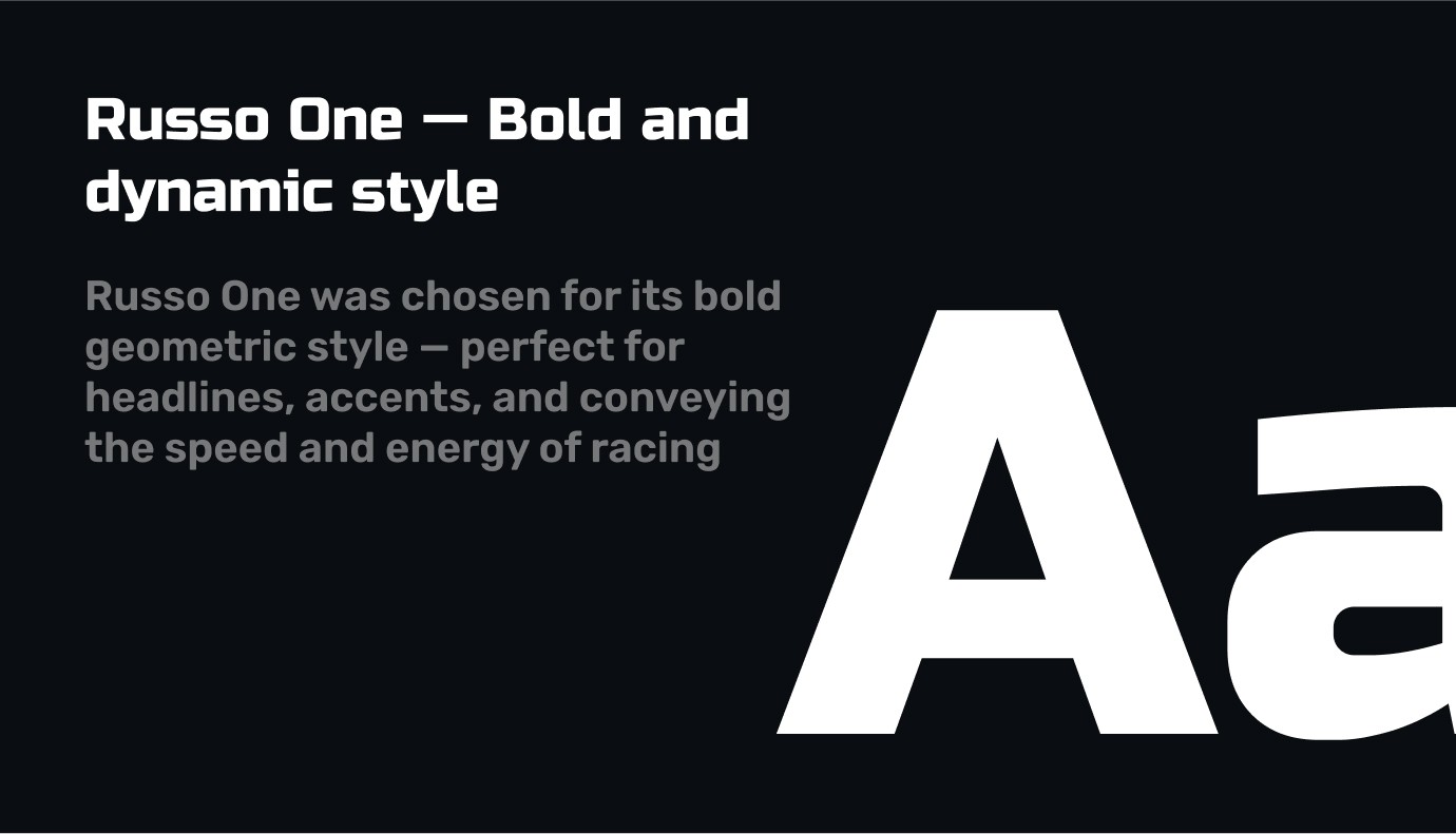 Russo One was chosen for its bold geometric style — perfect for headlines, accents, and conveying the speed and energy of racing